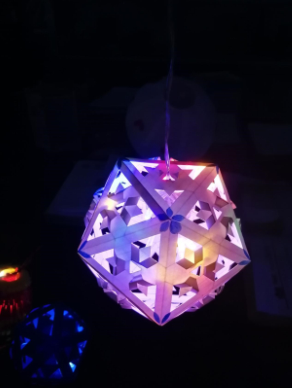 二十个面的三角棱,给人一种现代设计的金属感,加上淡紫色的灯光,边缘的花瓣,却让人感觉柔和宁静,体会到不同却不冲突的美感。